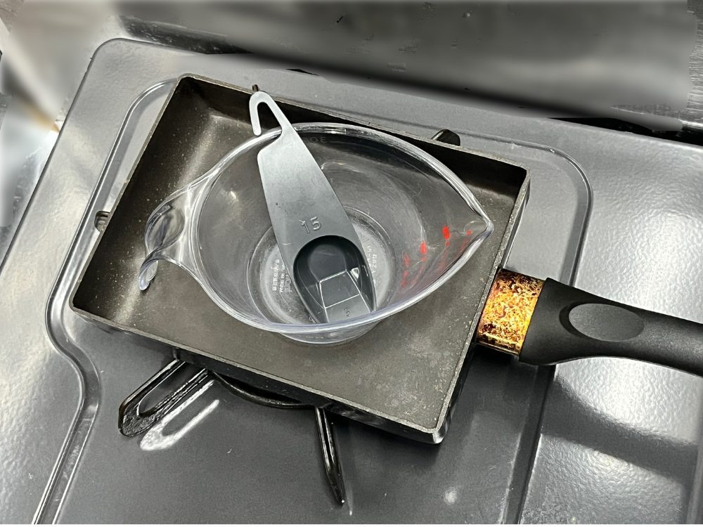 玉子焼き用のフライパンと、たまごを混ぜるカップ、おおさじをまとめてコンロの上に置いています。