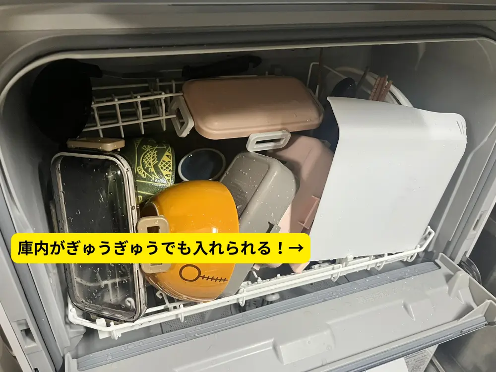 大きなお皿の横や、隙間にパズルのように収まります。我が家の食洗機(NP-TSP1)のような据え置き型でも、ほぼ場所を取りません。 - 2枚持ちが「時短」のコツ